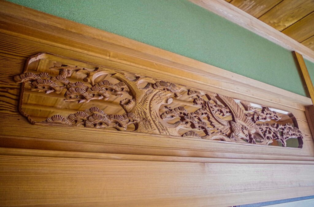 Carved wooden ranma (transom panel) depicting cranes and pine trees in a traditional Japanese interior.