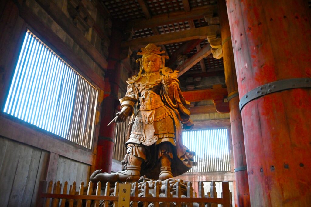 Wooden standing statue of Komokuten (Guardian King of the West) in the Great Buddha Hall of Todaiji Temple, Nara, Japan.