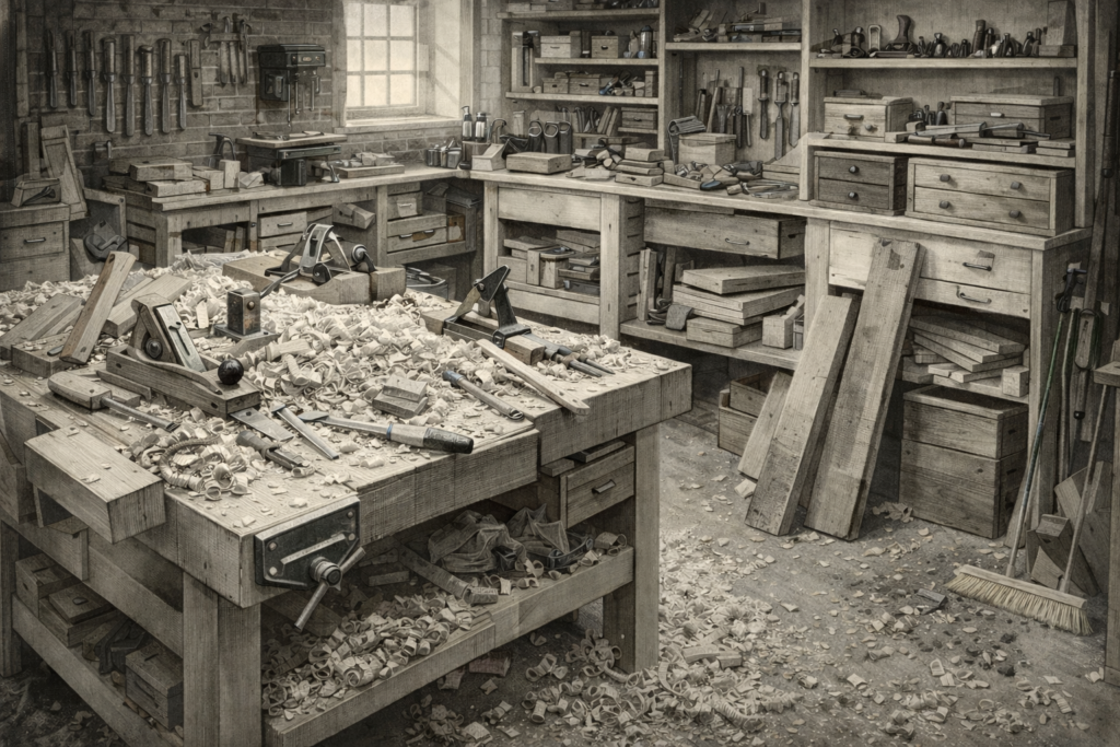 木の香りが満ちる作業場。削り屑が舞い、ノミを叩く音だけが響く空間――。